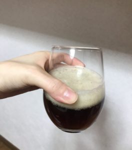 グラスに注ぐとレッドよりも色が濃くて、黒ビールみたいな色。すごく泡立ったけれど、泡はすぐなくなりました。